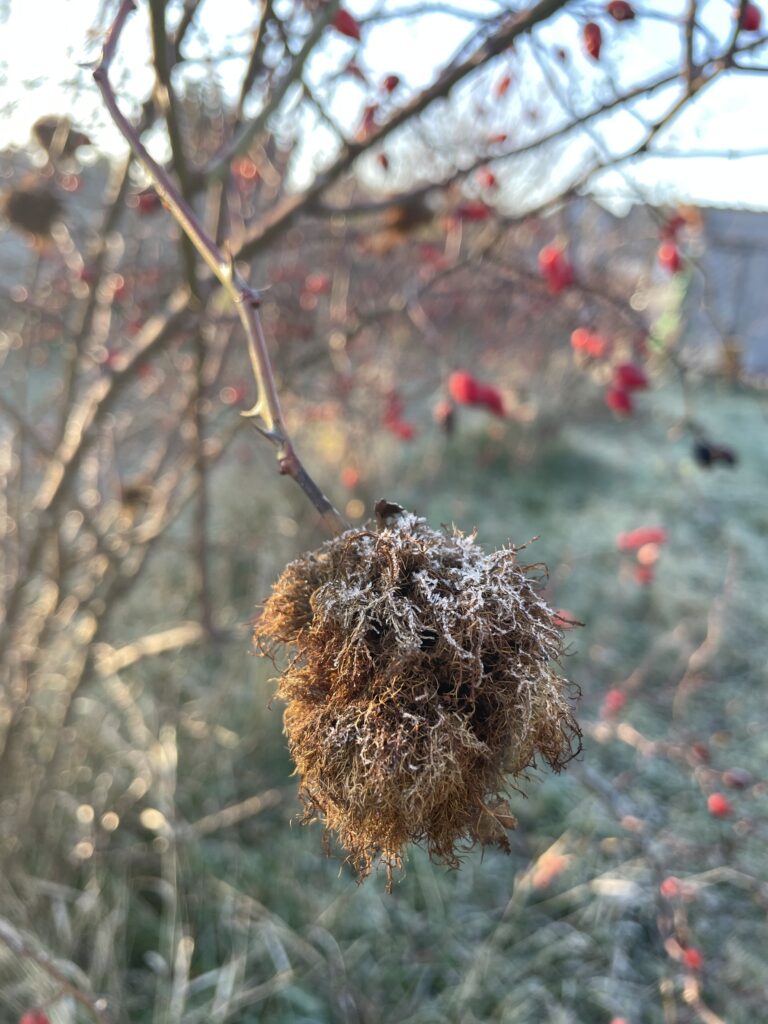 Hast du in den Rosensträuchern schon einmal diese kunstvollen zottigen Gebilde entdeckt und dich gewundert, was es damit auf sich hat? Dabei handelt es sich um Rosengallen. Zwischen Mai und Juni legen die Gallwespen ihre Eier in die jungen Triebe der Hundsrose. Die Larven schlüpfen nach wenigen Tagen und fressen sich durch die Pflanze. Die Pflanze reagiert darauf mit Wucherungen die somit die Kinderstube der Gallwespen-Larven sind. Nach circa zwei Monaten ist das Wachstum abgeschlossen und die Larven überwintern in den Gallen. Im Frühjahr verpuppen sie sich und schlüpfen im Frühsommer.