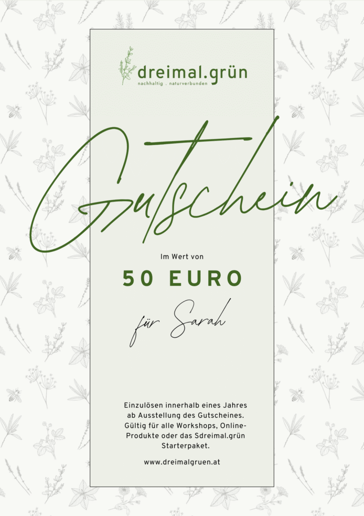 Schreibe mir deine Wunschsumme an hallo@dreimalgruen.at und du erhältst einen liebevoll verpackten Gutschein für eine ganz besondere Frau in deinem Leben!